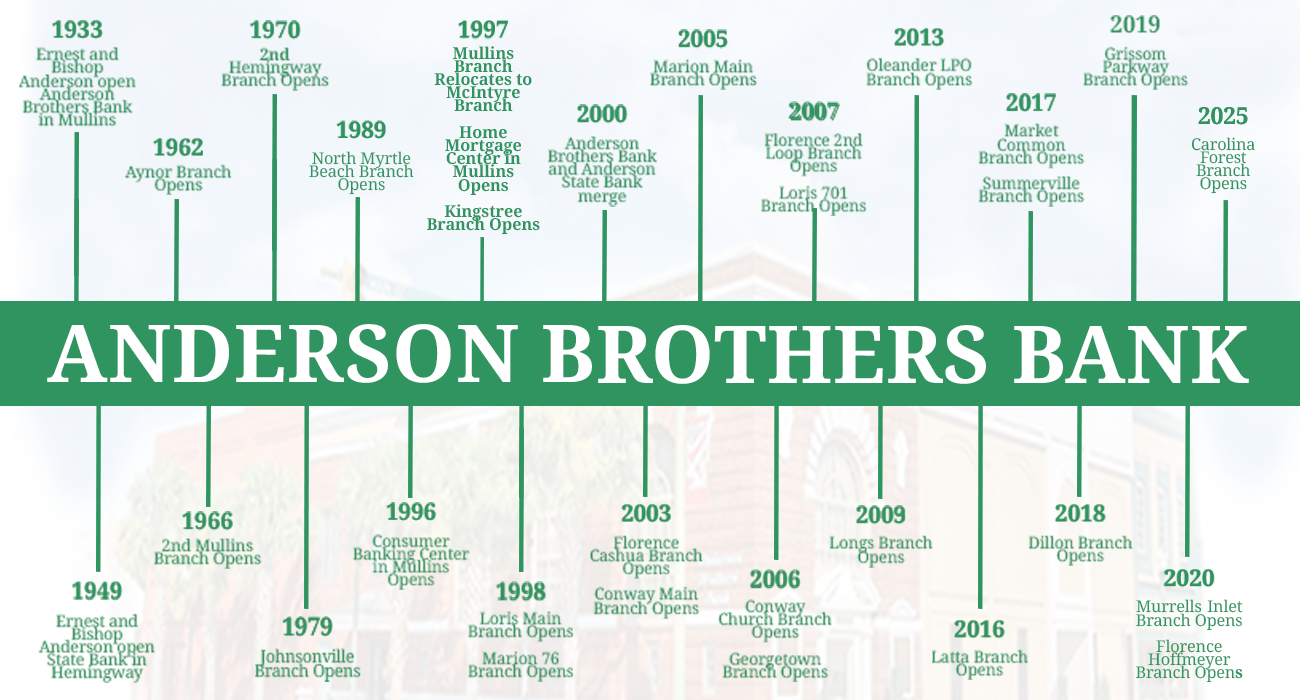 Anderson Brothers Bank is a full-service community bank with branches throughout the Pee Dee, Coastal, and Low Country regions of South Carolina.